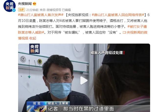#唐山打人案被害人首次发声# 【央视独家视频:#唐山打人案被害人回应网络传言#】6月10日凌晨,陈某志等人对4名被害人拳打脚踢并使用椅子、酒瓶击打,又将被害人拖拽到烧烤店外继续殴打。面对持续施暴,被害人跑进烧烤店旁的小巷子。#被打女子遭陈某志等人威胁#。对于网传“被车碾轧”,被害人回应称“没有”