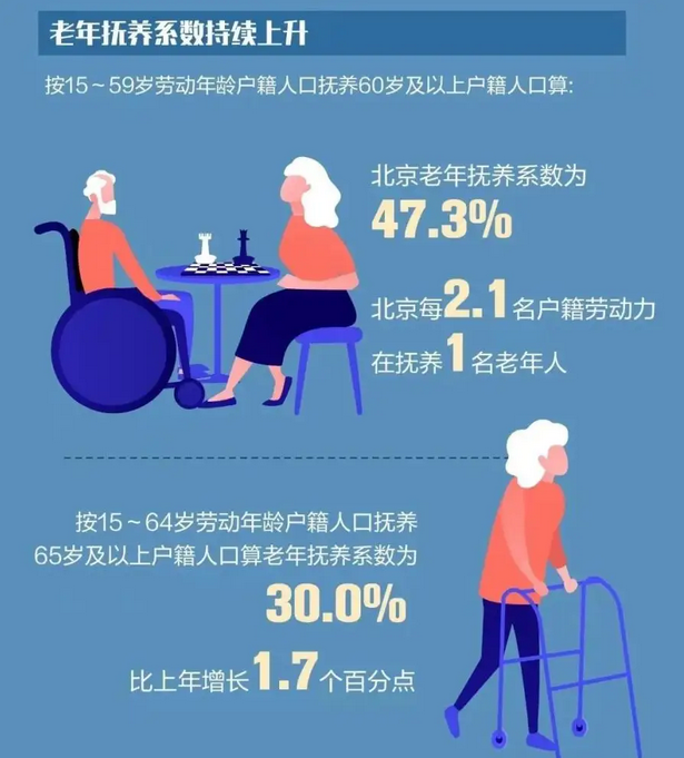 步入老年社会:北京60岁及以上常住人口首破20% 作者: xiaomidaifa 发布: 2022年9月2日 18:43:29 208阅读 据北京日报客户端9月2日消息,2021年,北京市60岁及以上常住人口占比首次突破20%,65岁及以上常住人口占比首次突破14%,这标志着北京市正式跨入中度老龄化社会。 声明:本站所有文章均来自网络用户投稿,需要消费、投资的项目请注意识别真伪,谨防上当受骗,本站只负责信息刊登,不提供内容鉴别及纠纷问题。投稿内容若侵犯了您的权益请及时联系客服删除。