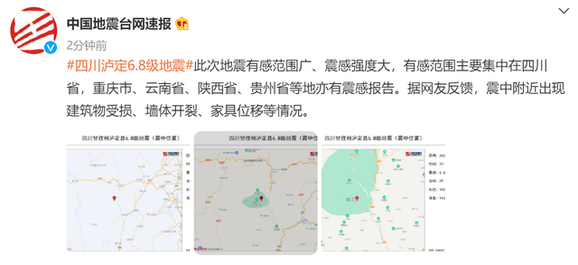 据中国地震台网速报报道,12时52分,在四川甘孜州泸定县(北纬29.59度,东经102.08度)发生6.8级地震,震源深度16千米。