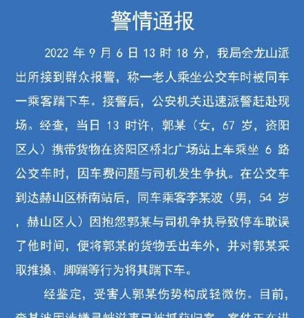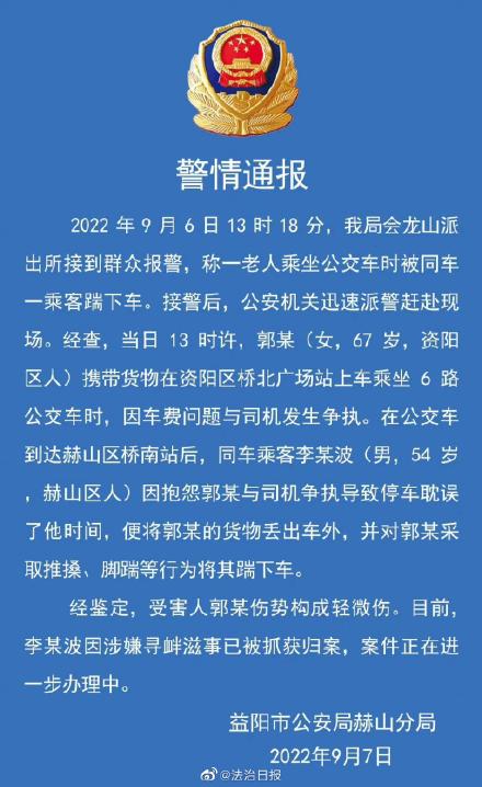 2022年9月6日,湖南一老人乘坐公交车时,因为携带两大包泡泡杆被司机要求交货票,因为发生口角被同车一乘客踹下车。据了解,这位同车乘客李某波(男,54岁,赫山区人)因抱怨郭某与司机争执导致停车耽误了他时间,便将郭某的货物丢出车外,并对郭某采取推搡、脚踹等行为将其踹下车。李某波因涉嫌寻衅滋事已被抓获归案,案件正在进一步办理中。