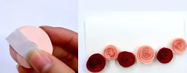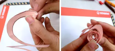 3.从大到小,沿着新剪下的螺旋形状慢慢把纸条卷成玫瑰形状。重复以上步骤,用不同颜色的彩纸制作彩色玫瑰。