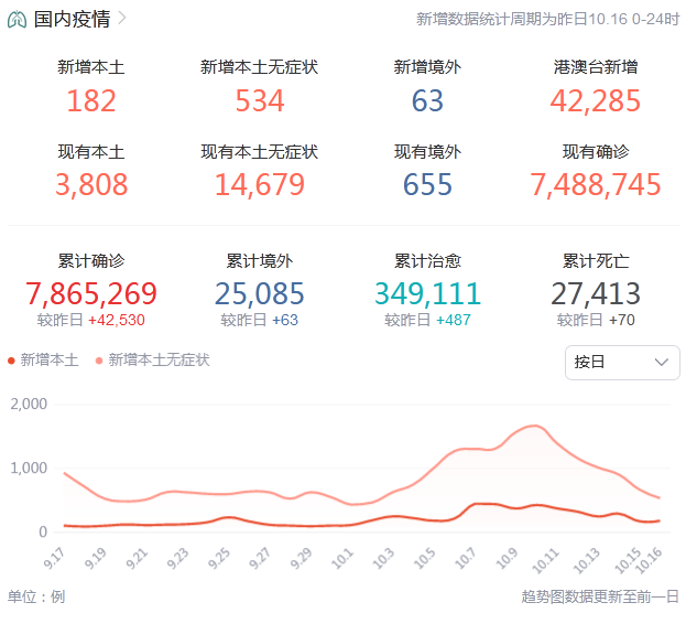 全国疫情最新公布|31省份新增本土182+534 作者: xiaomidaifa 发布: 2022年10月17日 14:43:08 204阅读 10月16日0至24时,31个省(自治区、直辖市)和新疆生产建设兵团报告新增本土确诊病例182例,新增本土无症状感染者534例。 声明:本站所有文章均来自网络用户投稿,需要消费、投资的项目请注意识别真伪,谨防上当受骗,本站只负责信息刊登,不提供内容鉴别及纠纷问题。投稿内容若侵犯了您的权益请及时联系客服删除。