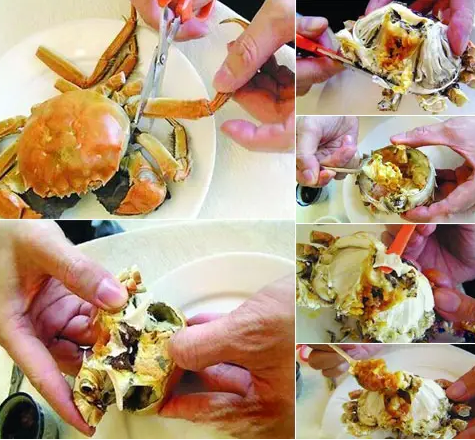 步骤5、去除蟹鳃后,把螃蟹腹部的三角形或桃形腹部剥开,此处为螃蟹的排泄处,如果担心清理不够干净,把腹部壳剥开是最简单的方法。