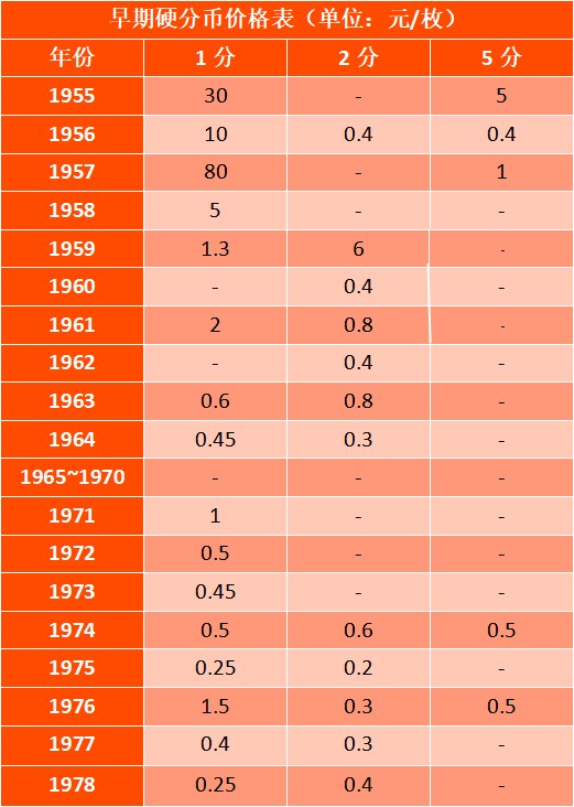 1960年以前的硬分币,价值更高。就比如1955年的1分品相好的值5457元。1955年5分,品相好的单枚也值1000元以上。1979年~2000年,这个时间段的硬分币的价格出现了两极分化的情况。贵的,每一枚的价格都非常吓人,再差一点的每一枚也要好几百甚至上千元。1955年3月1日开始发行的第二套人民币中的原版1953年壹分纸币,票券正面有三个罗马冠字和七位数字的编号。该钞票目前已经比较罕见。在收藏品市场中,一套原版1953年纸分币(含壹分、贰分、伍分)零售价目前大约在百万元左右成套的话(一分、二分、五分)价值更高。