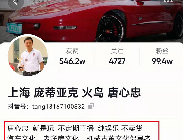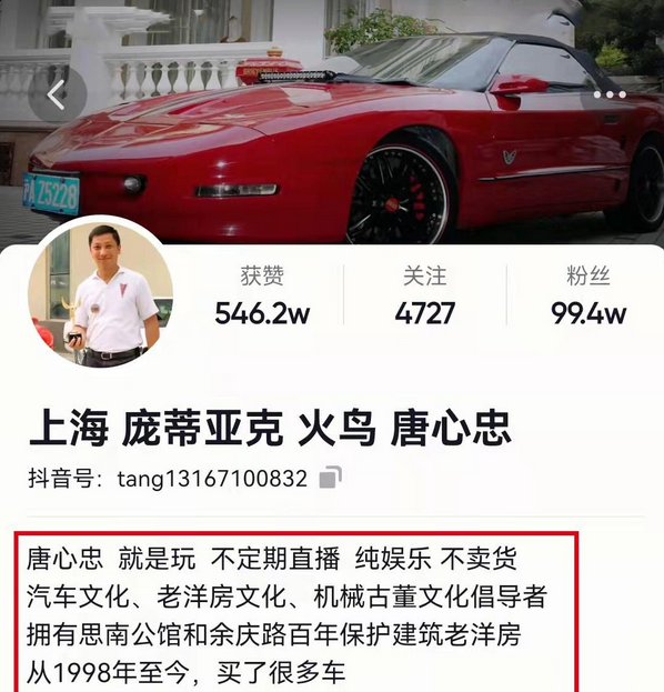 唐心忠网名叫:上海庞蒂亚克火鸟唐心忠,他主要分享的就是老洋房文化、汽车文化,正如他的抖音个人介绍:“”唐心忠,就是玩,不定期直播,纯娱乐,不卖货,汽车文化、老洋房文化、机械古董文化倡导者,拥有思南公馆和余庆路百年保护建筑老洋房,从1998年至今,买了很多车,唯独最钟爱庞蒂亚克火鸟和凯迪拉克帝威,带你走进我的情怀人生……”
