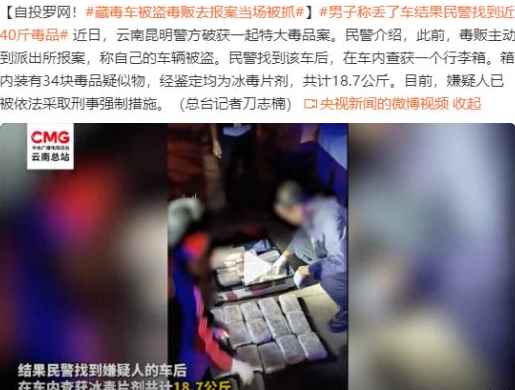藏毒车被盗毒贩去报案当场被抓,网友:智商堪忧 作者: 今日代发 发布: 2023年9月17日 09:41:45 154阅读 云南昆明警方破获一起特大毒品案。民警介绍,此前,毒贩主动到派出所报案,称自己的车辆被盗。民警找到该车后,在车内查获一个行李箱。箱内装有34块毒品疑似物,经鉴定均为冰毒片剂,共计18.7公斤。目前,嫌疑人已被依法采取刑事强制措施。 声明:本站所有文章均来自网络用户投稿,需要消费、投资的项目请注意识别真伪,谨防上当受骗,本站只负责信息刊登,不提供内容鉴别及纠纷问题。投稿内容若侵犯了您的权益请及时联系客服删除。