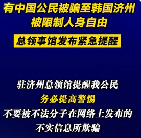 近期,我们驻济州总领馆接到多起中国公民被骗至韩国济州的求助。这些不法分子在网络上以高薪为诱饵,招揽国内人员来济非法务工。被骗人员中,有的护照被扣押无法回国,有的被强行索要中介费蒙受经济损失,有的甚至被限制人身自由。