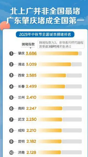 城市拥堵方面,广东肇庆、清远位居全国前二,拥堵指数均破3。意味着同样的路程,需要比平时超3倍时间才能通过,显示出大湾区节假通勤的交通压力。而陕西西安,也凭借2.5的拥堵指数,成为北方当前拥堵城市代表。