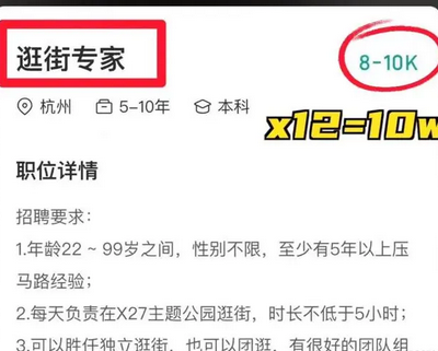 近日,杭州一公司招聘启事火了:年薪十万招聘“逛街专家”,每天只需要逛街5小时以上。据了解,该岗位不限性别,只需要有5年以上压马路经验均可应聘,“MBTI人格S型人格优先”、“很强的膝关节控制能力”则是加分项。