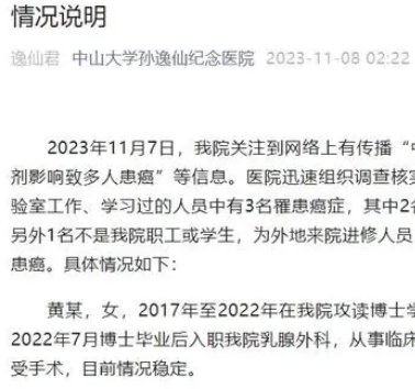 8号凌晨,中山二院发布了正式通知,确实有本院2名试验人员和1名外来进修人员患癌,但是患癌的原因复杂,是不是与试剂有关,并不能确定。