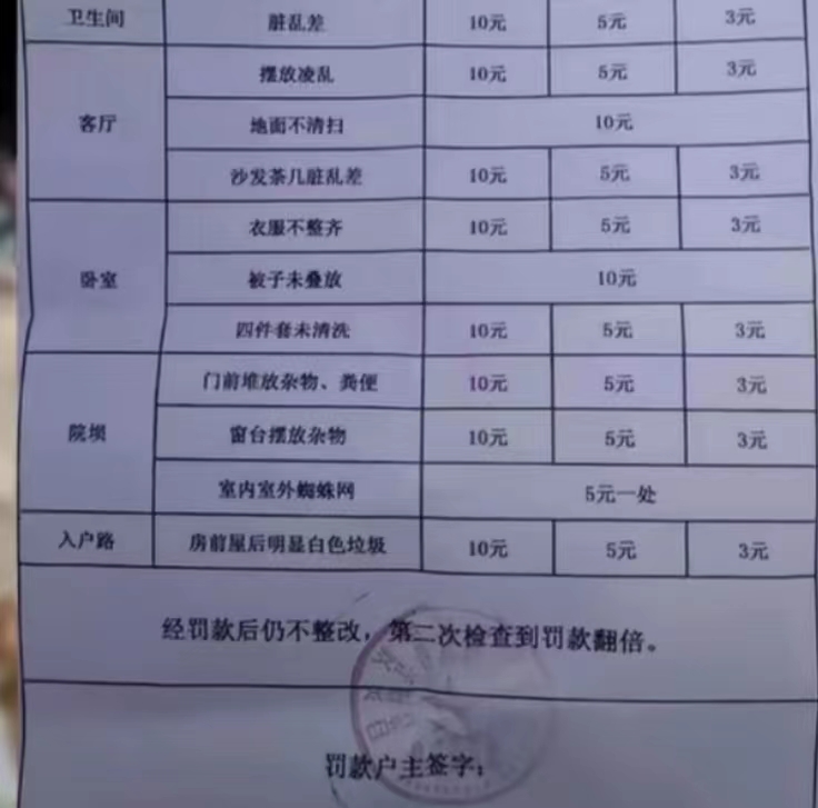 近期,四川凉山彝族普格县发布了一份名为《新农村美丽乡村行动人居环境罚款标准》,规定中写有蹲地用餐罚款20元,不叠被,不洗碗等均会被罚款。对此,普格县宣传部工作人员表示,确实有人进行人居环境整顿行动,但是每个地方政策不同,对于这种罚款不知情。