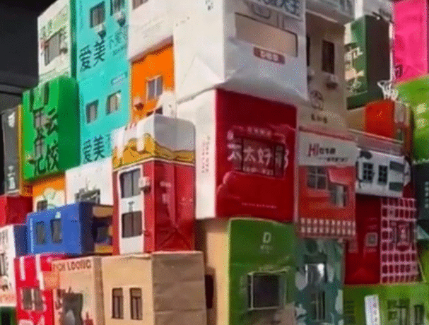 据作者介绍,这件作品灵感源于日常生活中的外卖文化。他将奶茶袋、快餐盒等废弃包装收集起来,通过剪裁、拼接、上色,将其转化为建筑模型。作品中的“城市”不仅还原了现代都市的繁华,更暗藏玄机——部分建筑外墙印有外卖订单小票,街道上“行走”的小人手中还提着未拆封的外卖袋。